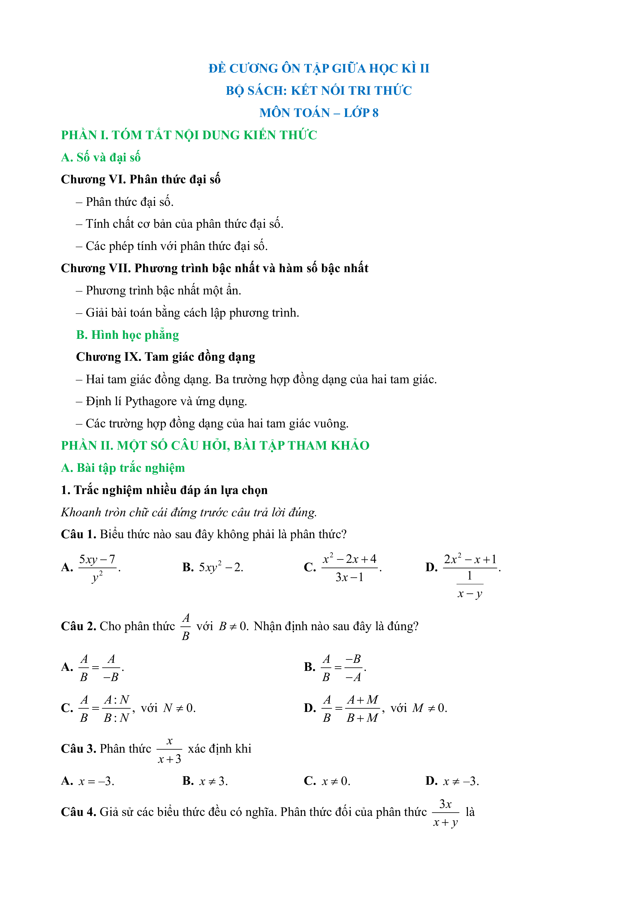 Đề cương ôn tập Giữa kì 2 Toán 8 Kết nối tri thức Cấu trúc mới
