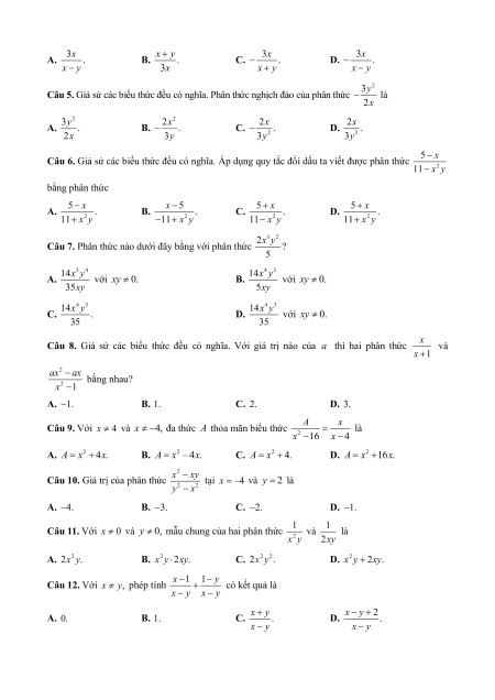 Câu 6. Giả sử các biểu thức đều có nghĩa. Áp dụng quy tắc đổi dấu ta viết được phân thức 5 x2 11 x y bằng phân thức A. 5 x . B. x 5 . C. 5 x . D. 5 x . 2 11 x y 2 11 x y 2 11 x y 2 11 x y 3 2