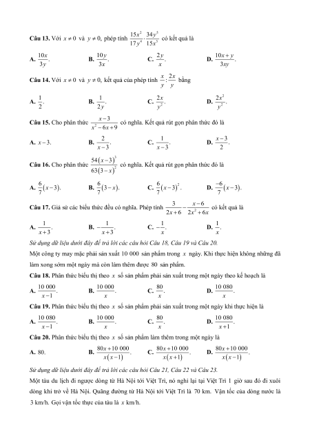 Câu 22. Phân thức biểu thị theo x thời gian tàu đi xuôi dòng từ Việt Trì tới Hà Nội là A. 140 . B. 70 . C. 70 . D. 70 . x 3 x 3 x 3 x 6