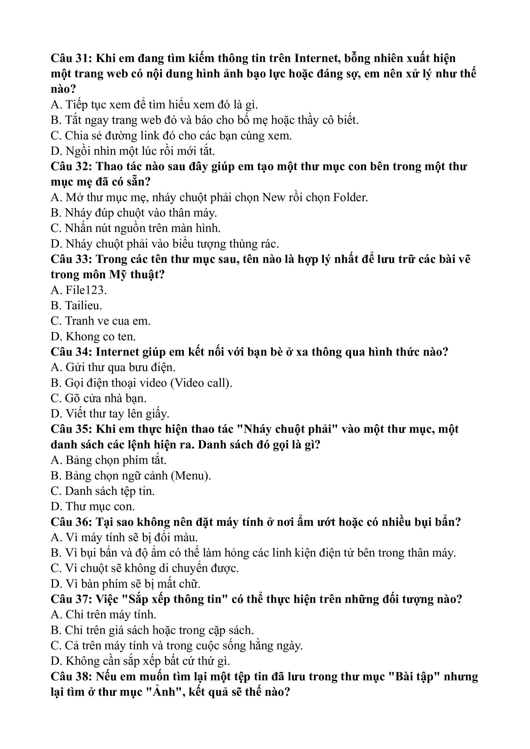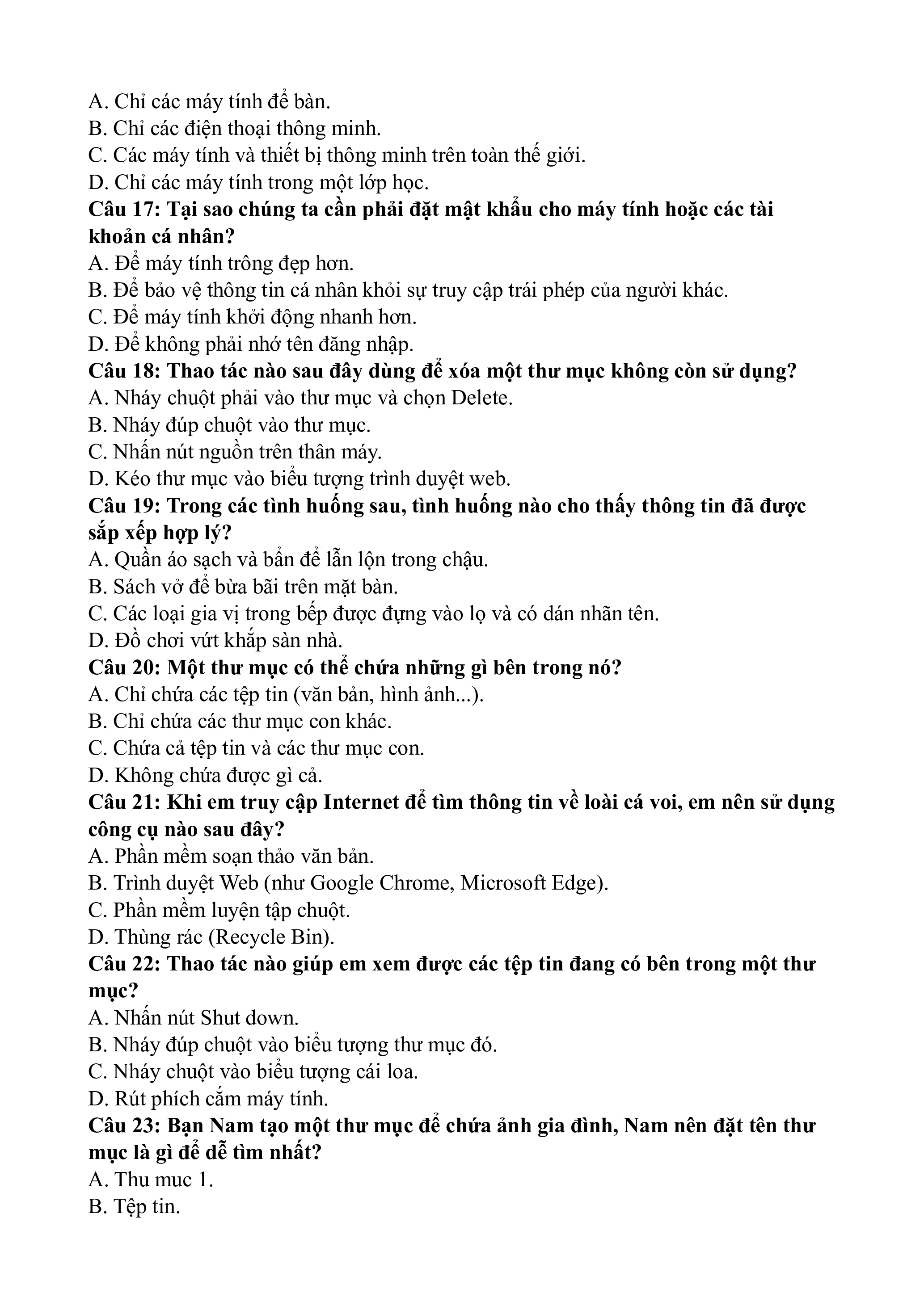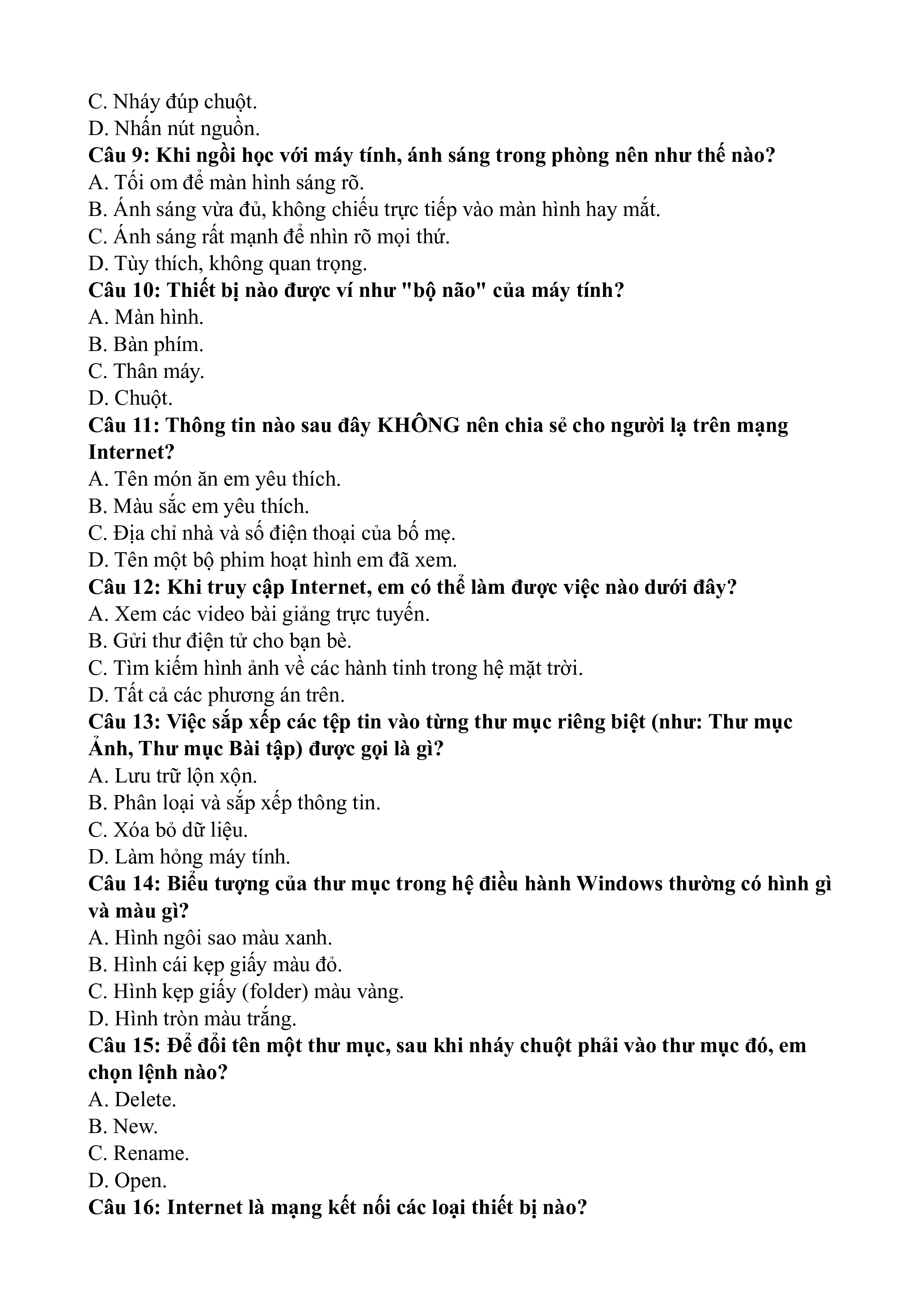 Câu 10: Thiết bị nào được ví như "bộ não" của máy tính? A. Màn hình. B. Bàn phím. C. Thân máy. D. Chuột.