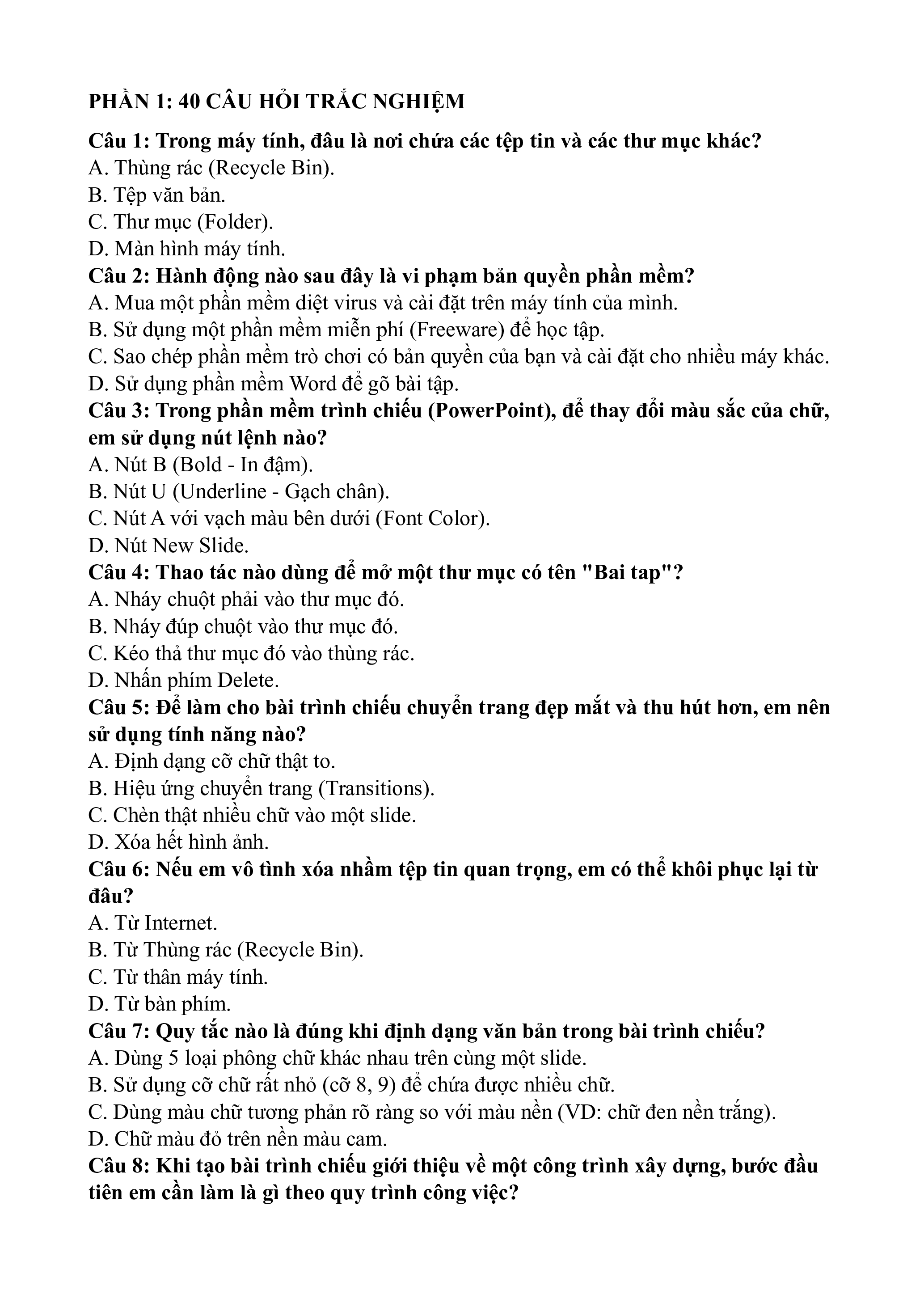 Câu 1: Trong máy tính, đâu là nơi chứa các tệp tin và các thư mục khác? A. Thùng rác (Recycle Bin). B. Tệp văn bản. C. Thư mục (Folder). D. Màn hình máy tính.