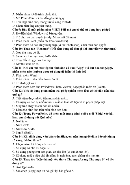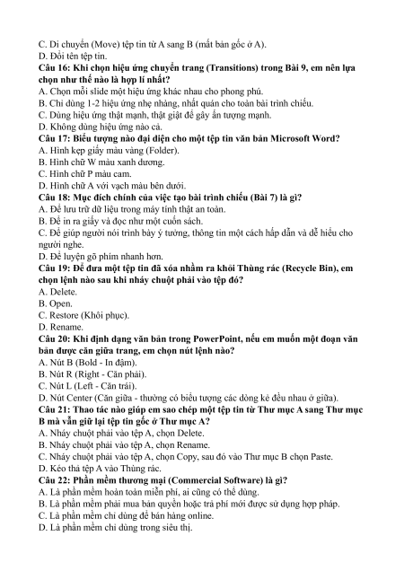Câu 15: Thao tác "Kéo thả một tệp tin từ Thư mục A sang Thư mục B" có tác dụng gì? A. Xóa tệp tin đó.