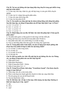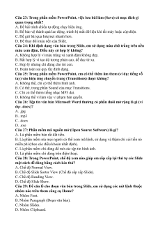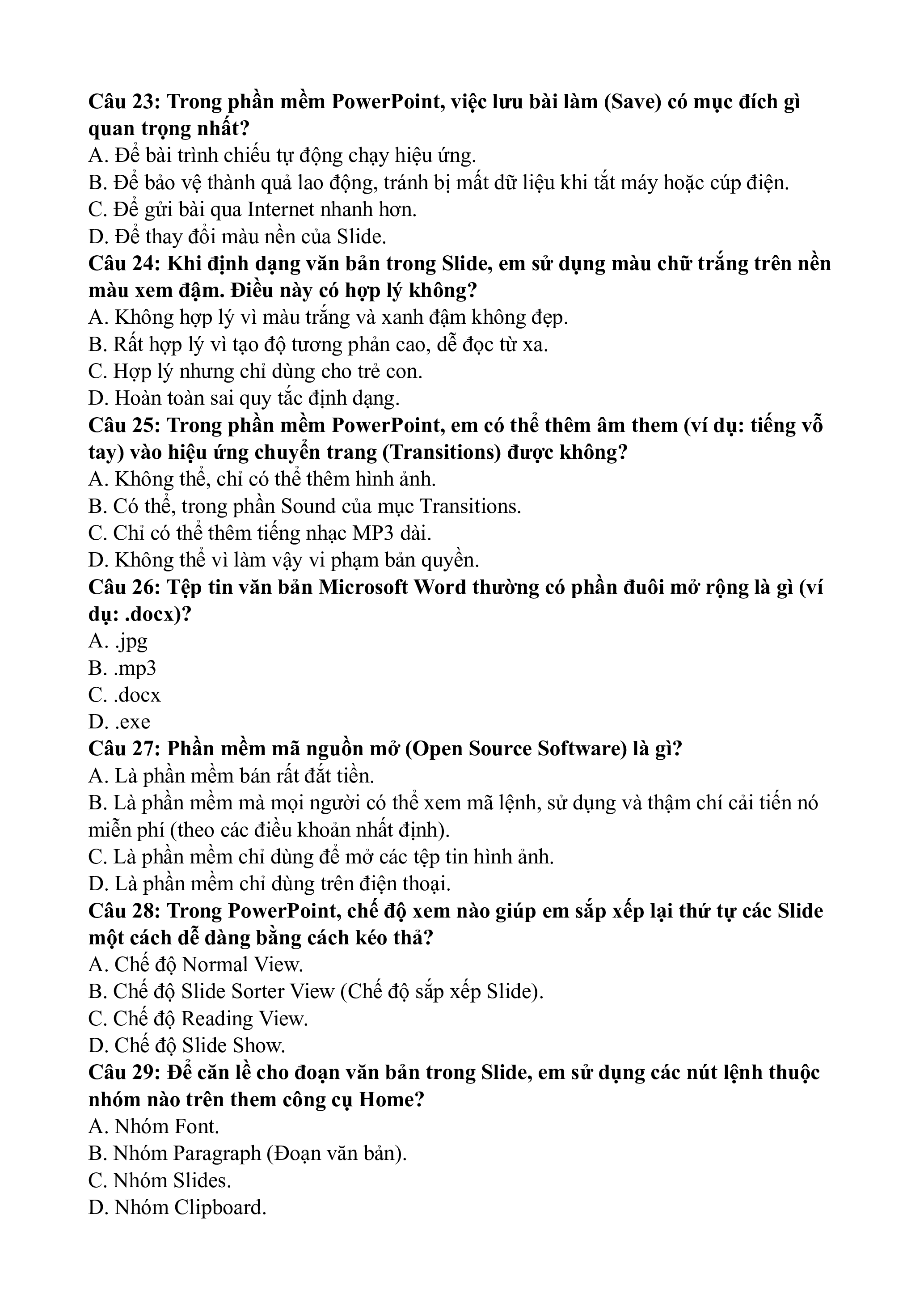 Câu 26: Tệp tin văn bản Microsoft Word thường có phần đuôi mở rộng là gì (ví dụ: .docx)? A. .jpg B. .mp3 C. .docx D. .exe