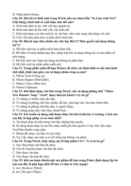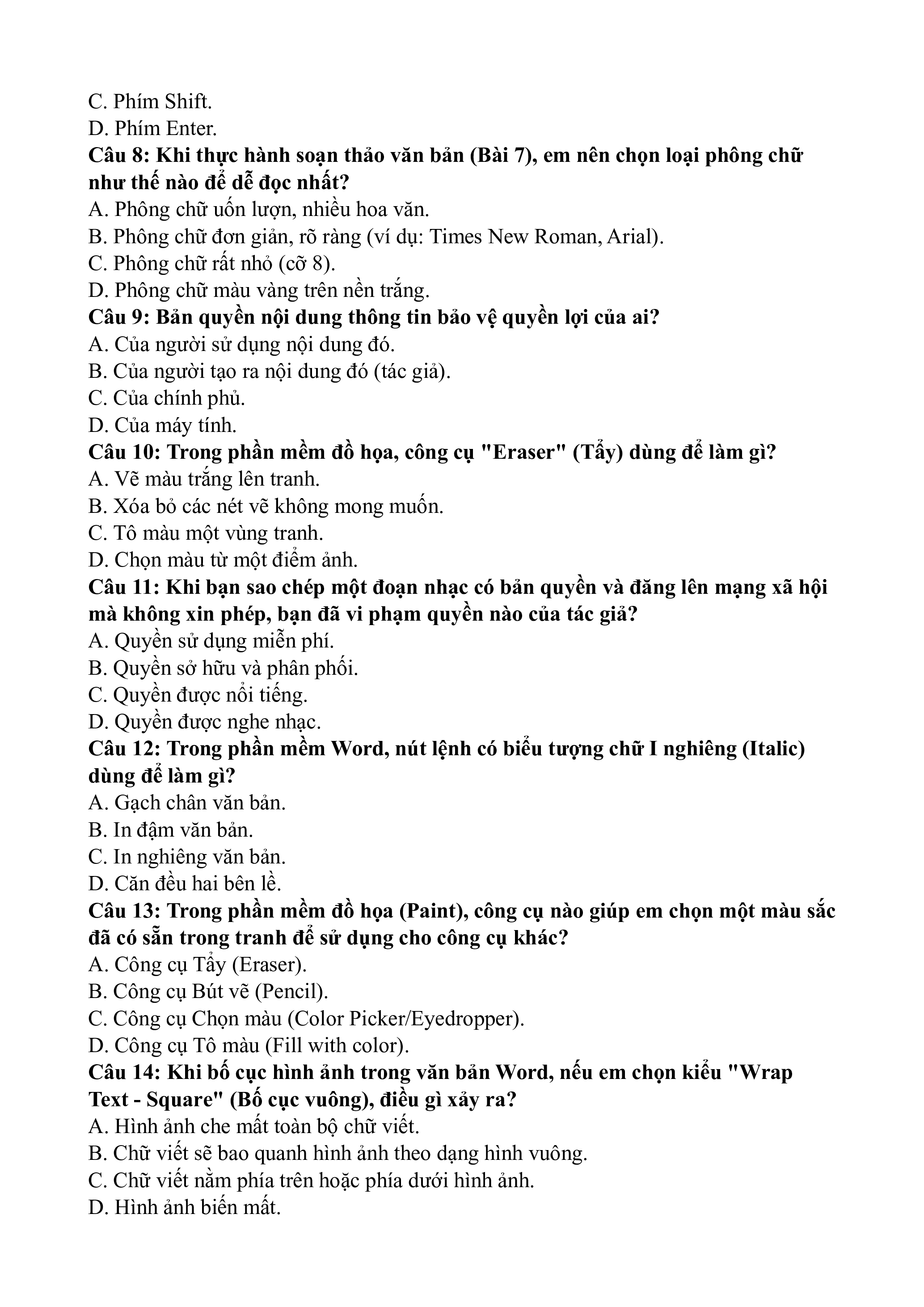Câu 2: Trong phần mềm Word, để làm cho chữ to hơn, em sử dụng nút lệnh nào? A. Nút B (Bold - In đậm).