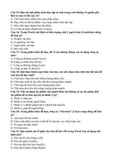 Câu 16: Trong Word, nút lệnh có biểu tượng chữ U gạch chân (Underline) dùng để làm gì? A. In đậm văn bản. B. In nghiêng văn bản. C. Gạch chân văn bản. D. Đổi màu chữ.