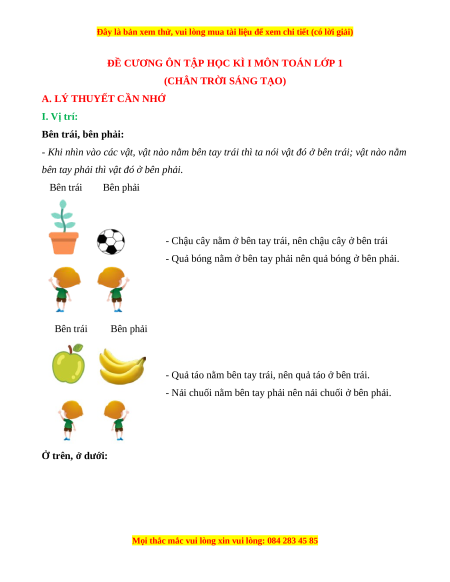 Đề cương ôn tập Học kì 1 Toán lớp 1 Chân trời sáng tạo