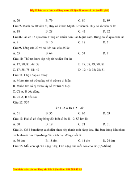 Câu 10. Thứ tự được sắp xếp từ bé đến lớn là: A. 17; 78; 81; 49; 38 B. 17; 38; 49; 78; 81 C. 17; 38; 78; 81; 49 D. 17; 49; 38; 78; 81