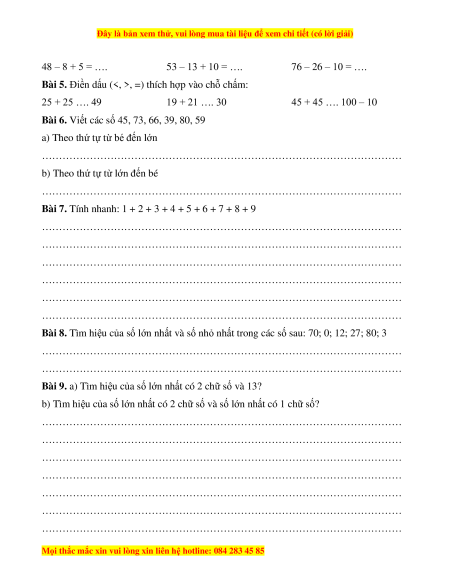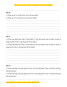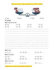 …………………………………………………………………………………………… Bài 2. Tính: 12 + 8 + 7 = …. 45 – 39 + 10 = …. 23 + 23 – 23 = …. Bài 3. Tính nhẩm: 10 + 10 = …. 70 + 30 = …. 10 + 60 + 30 = …. 100 – 40 = …. 80 – 50 – 10 = …. 90 – 20 + 30 = …. Bài 4. Tính nhẩm 28 + 2 + 6 = …. 17 + 3 + 8 = …. 39 + 1 + 3 = ….
