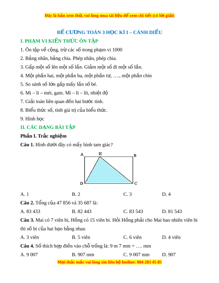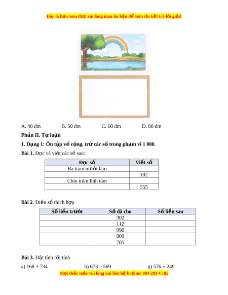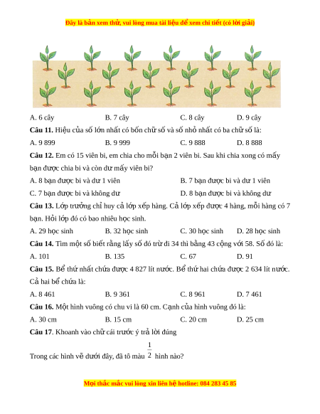 Đây là bản xem th , vu ử i lòng mua tài li u ệ đ xe ể m chi ti t (c ế ó l i ờ gi i ả ) A. 6 cây B. 7 cây C. 8 cây D. 9 cây Câu 11. Hi u c ệ a ủ s l ố n nh ớ t ấ có b n ch ố ữ s và s ố nh ố ỏ nh t ấ có ba ch s ữ l ố à: A. 9 899 B. 9 999 C. 9 888 D. 8 888