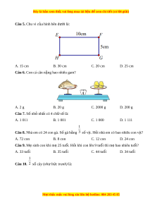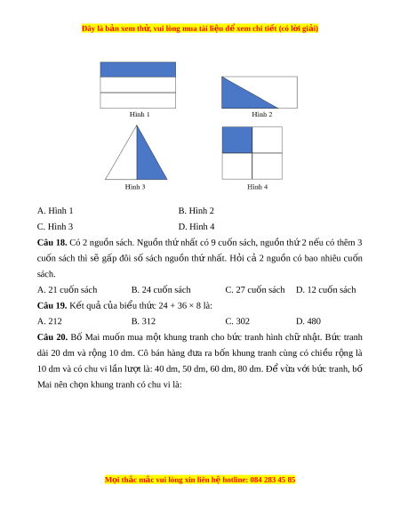 Đây là bản xem th , vu ử i lòng mua tài li u ệ đ xe ể m chi ti t (c ế ó l i ờ gi i ả ) A. Hình 1 B. Hình 2 C. Hình 3 D. Hình 4 Câu 18. Có 2 ngu n ồ sách. Ngu n ồ th ứ nh t ấ có 9 cu n ố sách, ngu n ồ th ứ 2 n u ế có thêm 3 cuốn sách thì sẽ g p ấ đôi số sách ngu n ồ thứ nh t ấ . H i ỏ cả 2 ngu n ồ có bao nhiêu cu n ố sách. A. 21 cuốn sách B. 24 cuốn sách C. 27 cuốn sách D. 12 cuốn sách Câu 19. K t ế quả c a bi ủ u ể th c ứ 24 + 36 × 8 là: A. 212 B. 312 C. 302 D. 480 Câu 20. Bố Mai mu n ố mua m t ộ khung tranh cho b c ứ tranh hình chữ nh t ậ . B c ứ tranh dài 20 dm và r ng ộ 10 dm. Cô bán hàng đ a ư ra b n