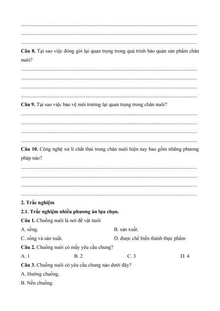 Câu 1. Chuồng nuôi là nơi để vật nuôi A. sống. B. sản xuất. C. sống và sản xuất.