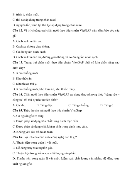 Câu 11. Tiêu chuẩn VietGAP là những A. nguyên tắc chăn nuôi.
