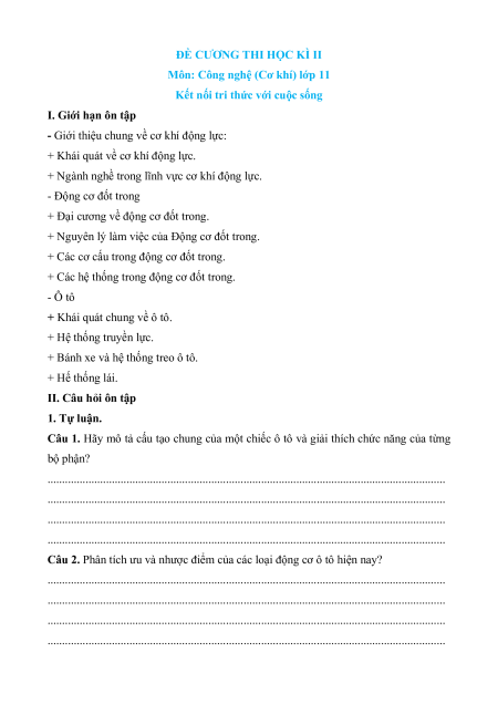 + Bánh xe và hệ thống treo ô tô. + Hế thống lái. II. Câu hỏi ôn tập 1. Tự luận.