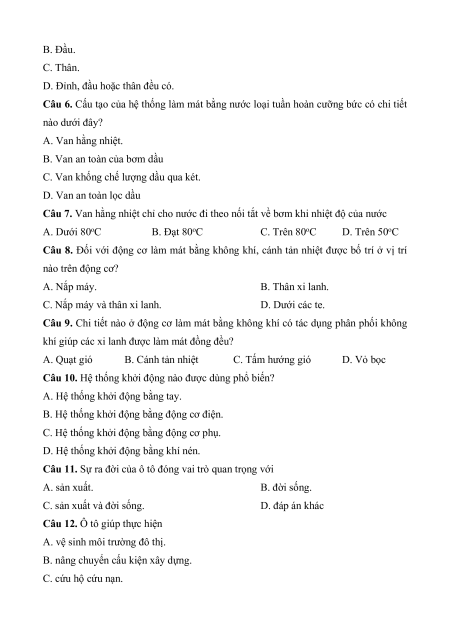 Câu 8. Đối với động cơ làm mát bằng không khí, cánh tản nhiệt được bố trí ở vị trí nào trên động cơ? A. Nắp máy. B. Thân xi lanh.