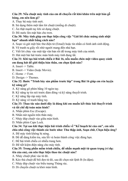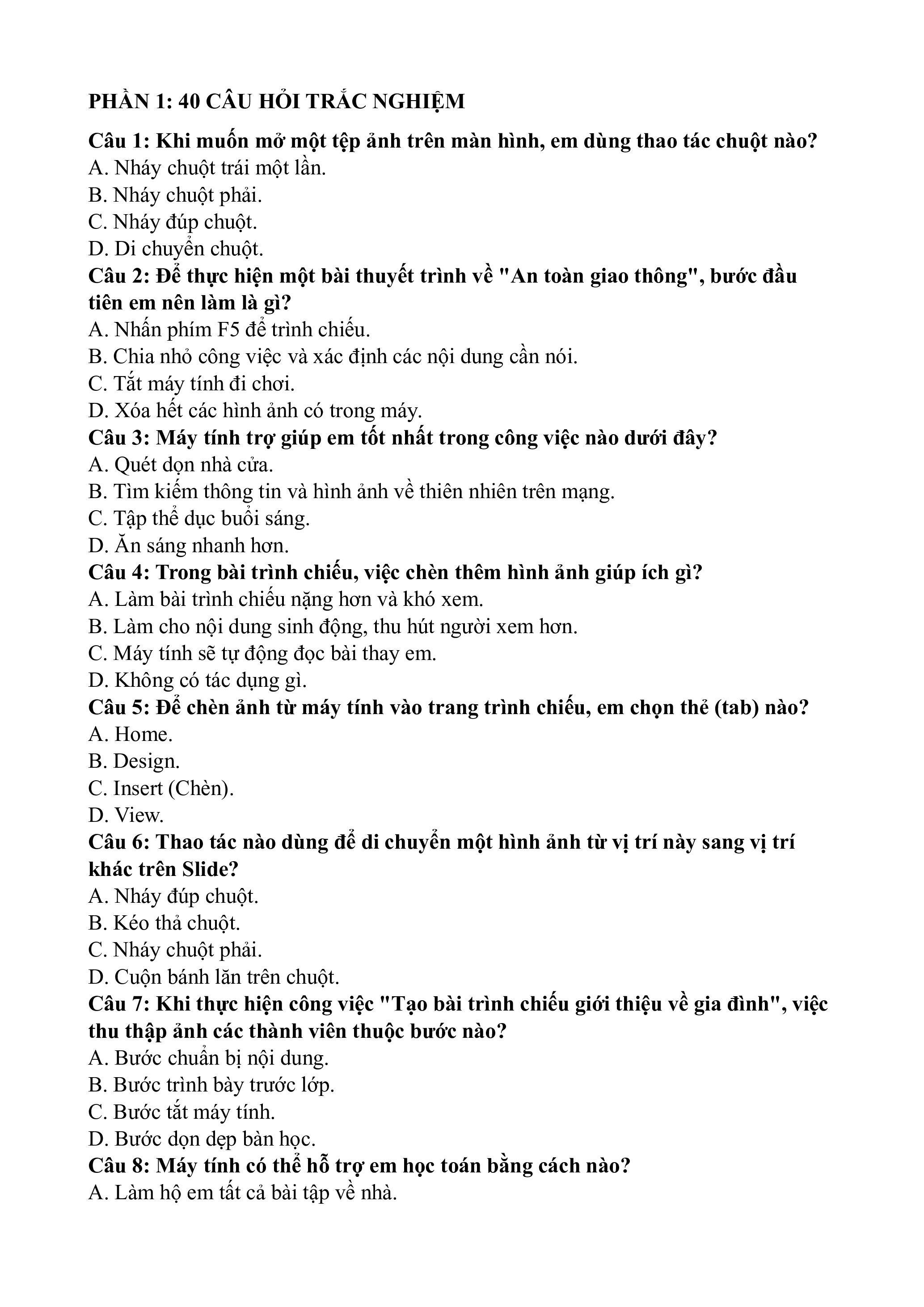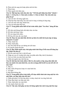 Câu 6: Thao tác nào dùng để di chuyển một hình ảnh từ vị trí này sang vị trí khác trên Slide? A. Nháy đúp chuột. B. Kéo thả chuột. C. Nháy chuột phải.