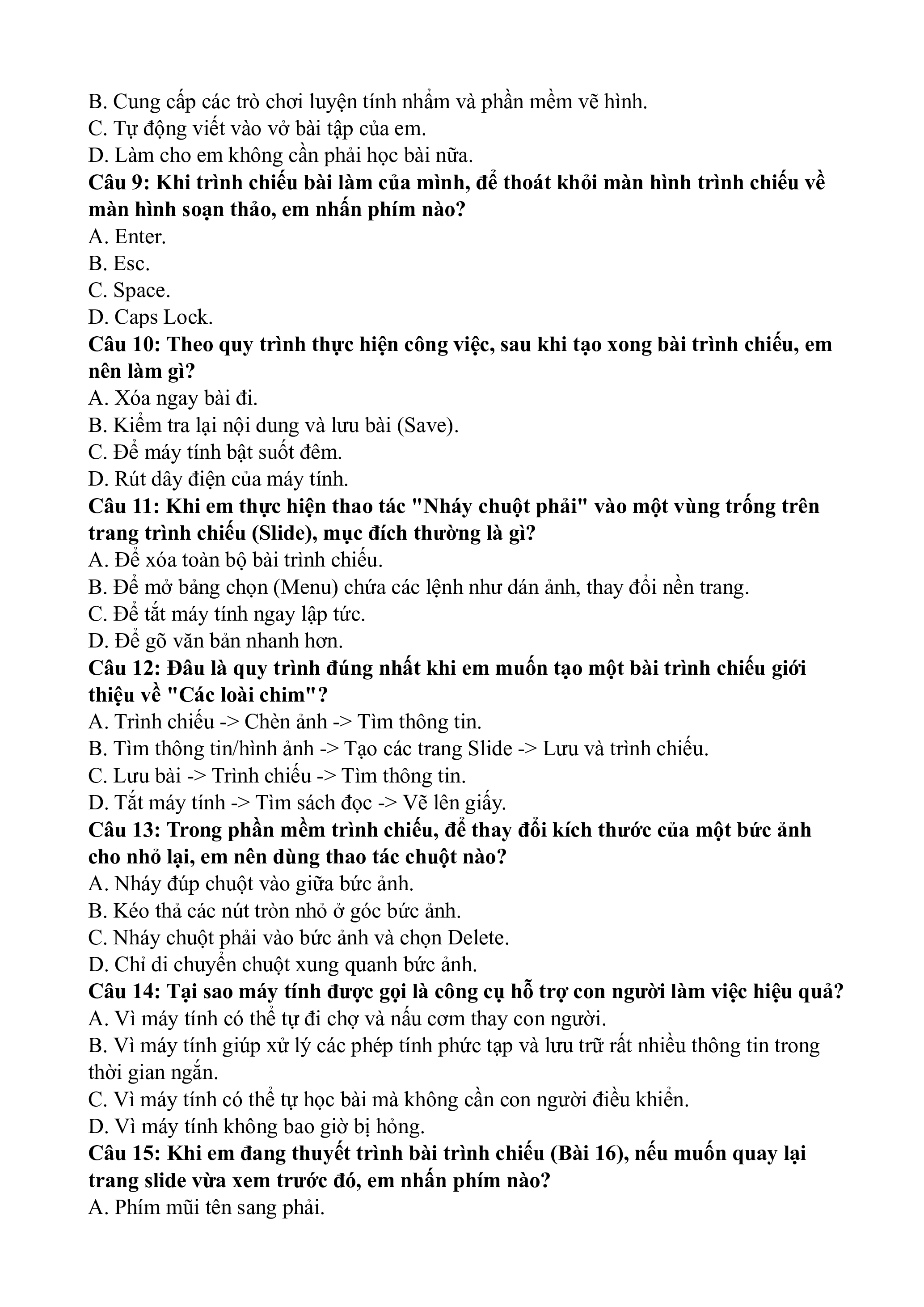 Câu 10: Theo quy trình thực hiện công việc, sau khi tạo xong bài trình chiếu, em nên làm gì? A. Xóa ngay bài đi.