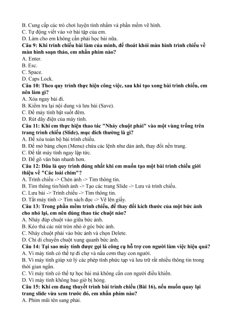 Câu 9: Khi trình chiếu bài làm của mình, để thoát khỏi màn hình trình chiếu về