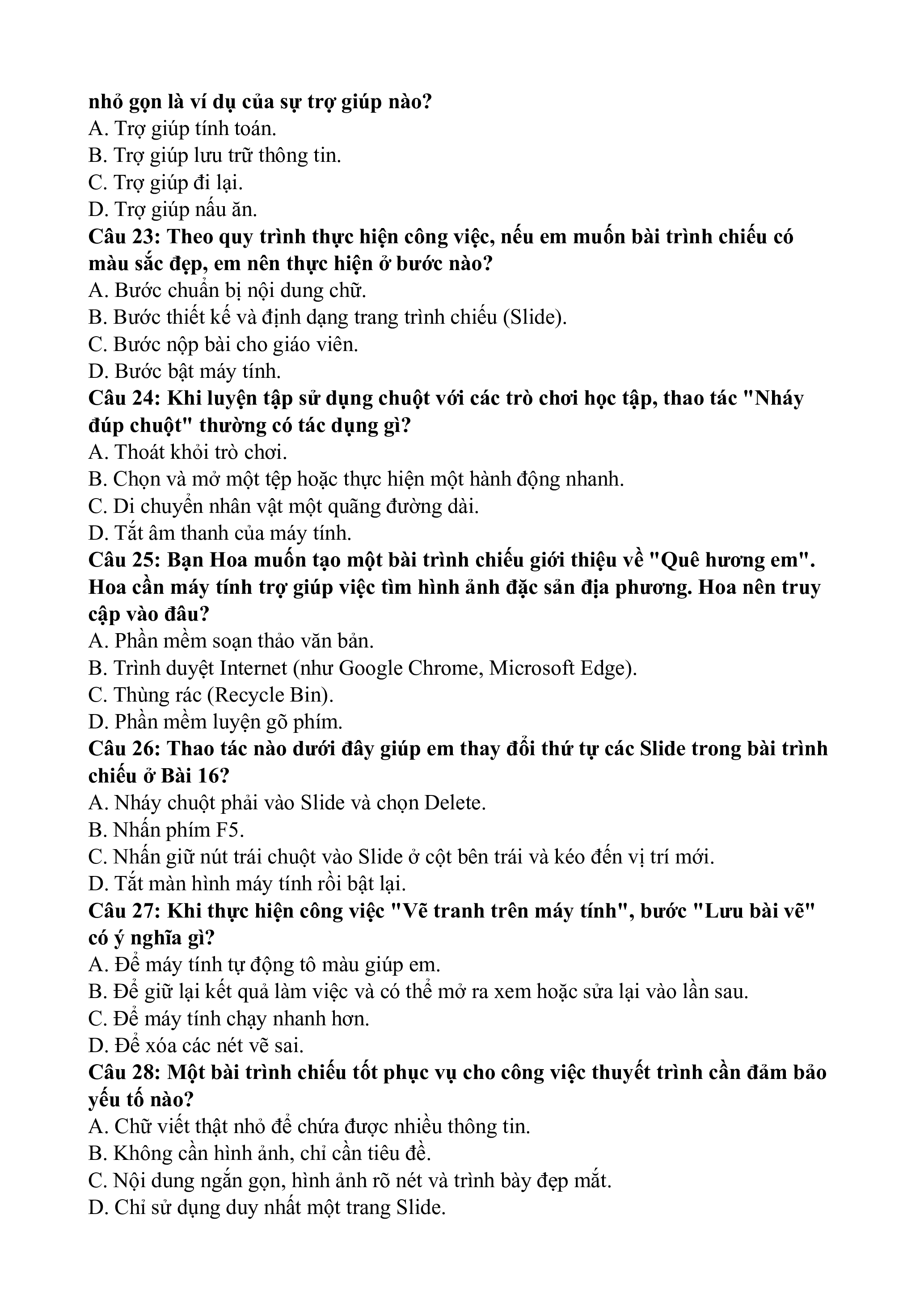 Câu 3: Máy tính trợ giúp em tốt nhất trong công việc nào dưới đây? A. Quét dọn nhà cửa.