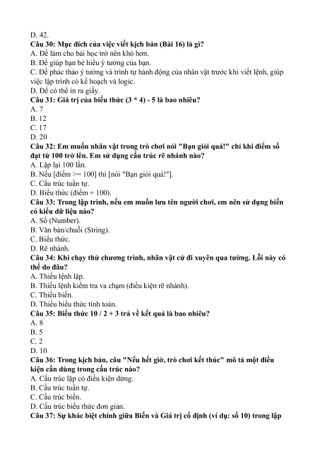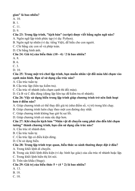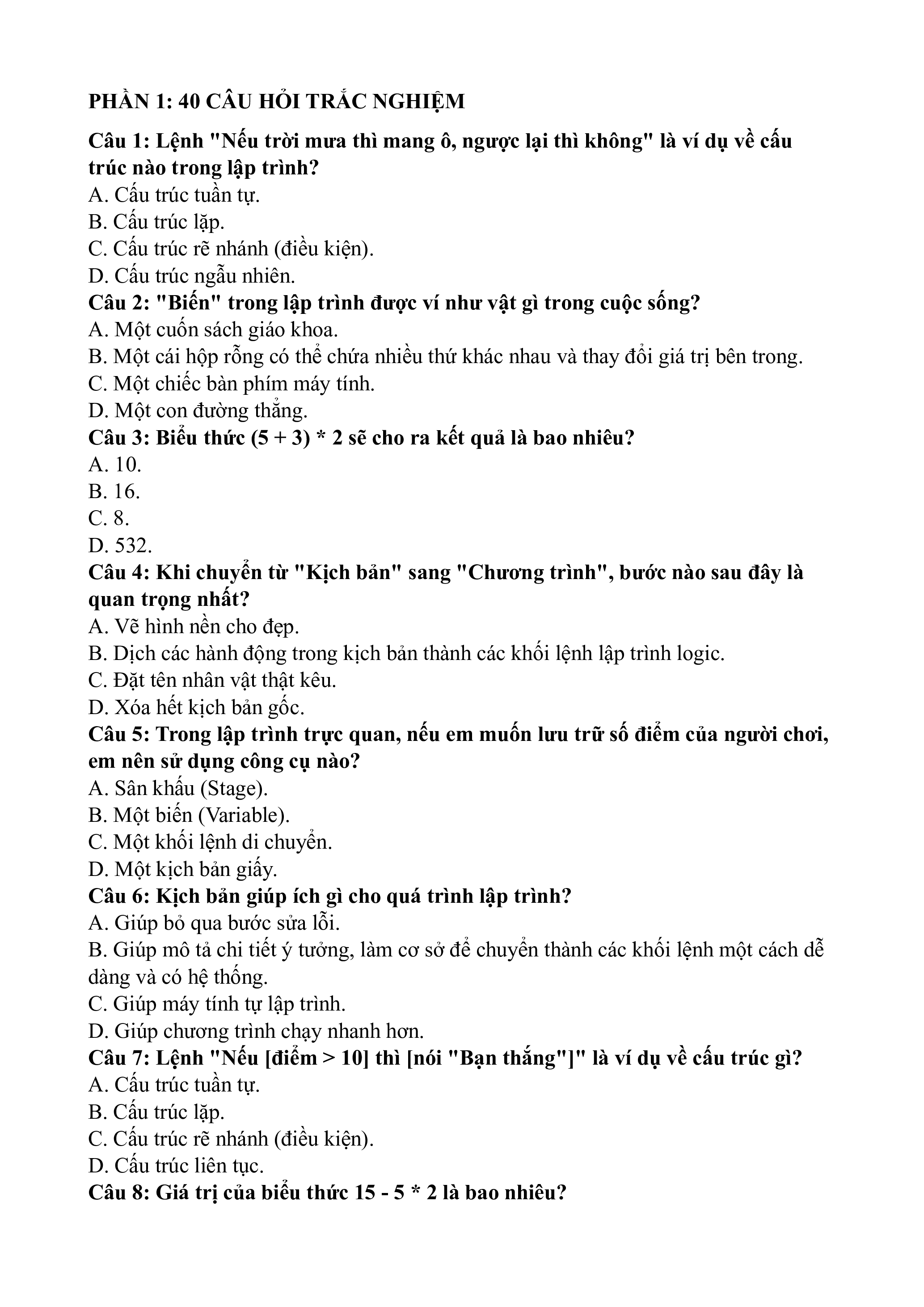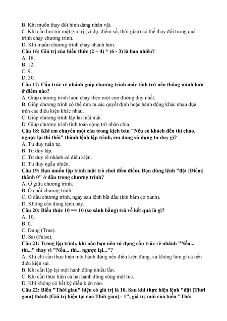 Câu 7: Lệnh "Nếu [điểm > 10] thì [nói "Bạn thắng"]" là ví dụ về cấu trúc gì? A. Cấu trúc tuần tự. B. Cấu trúc lặp.