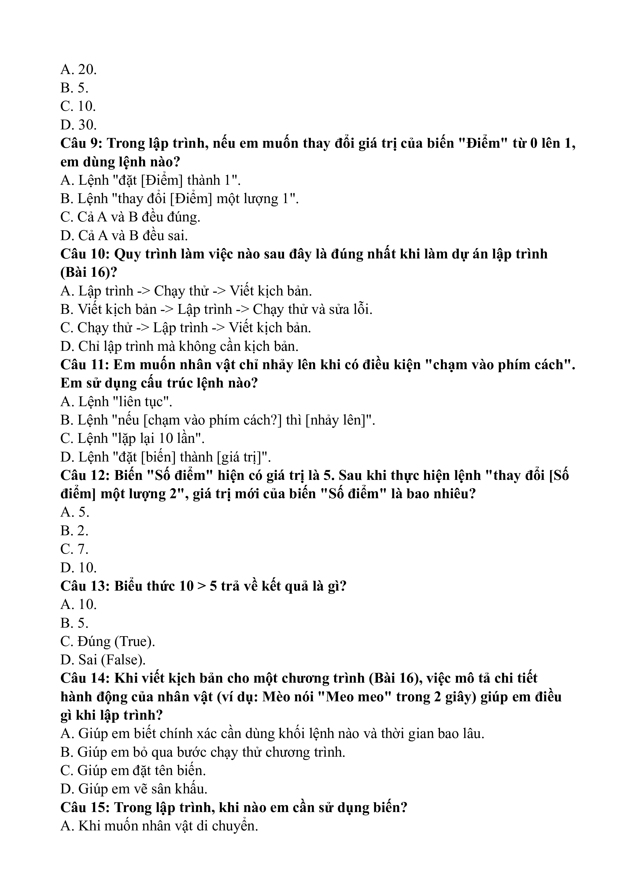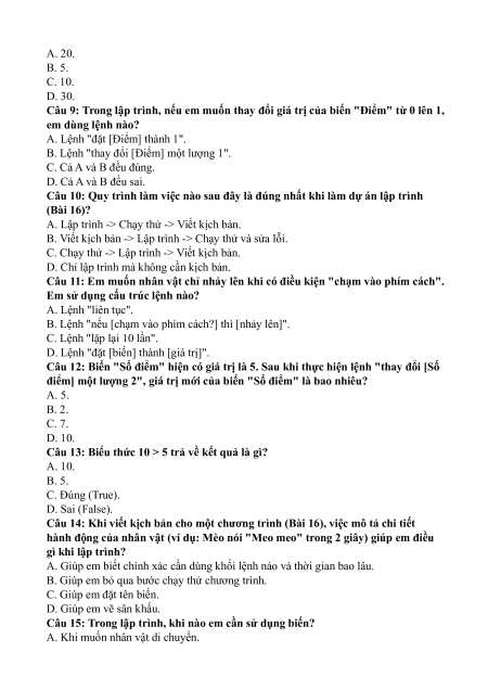Câu 8: Giá trị của biểu thức 15 - 5 * 2 là bao nhiêu? A. 20. B. 5. C. 10. D. 30.