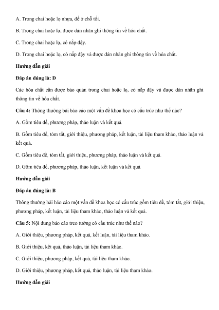 D. Trong chai hoặc lọ, có nắp đậy và được dán nhãn ghi thông tin về hóa chất. Hướng dẫn giải Đáp án đúng là: D