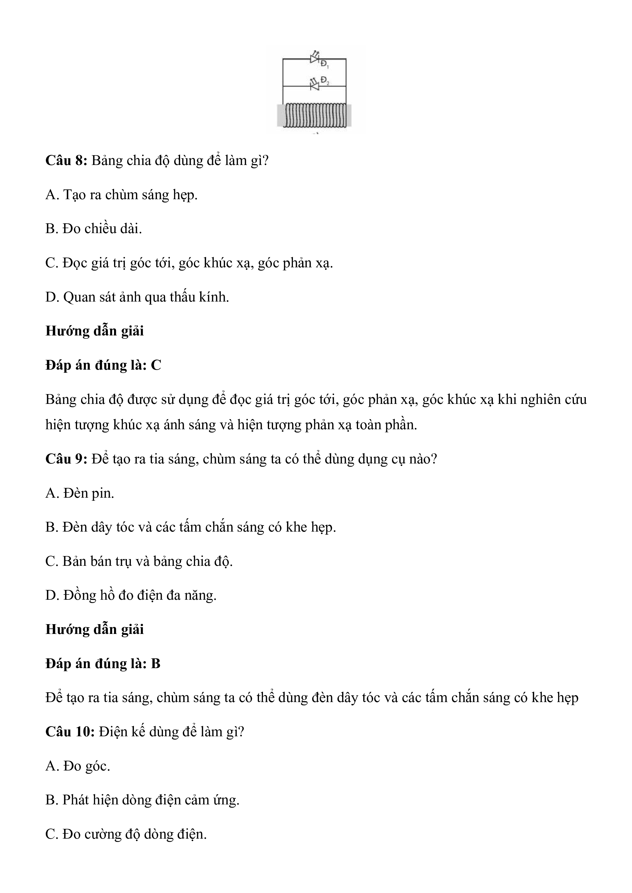 Câu 8: Bảng chia độ dùng để làm gì? A. Tạo ra chùm sáng hẹp. B. Đo chiều dài.