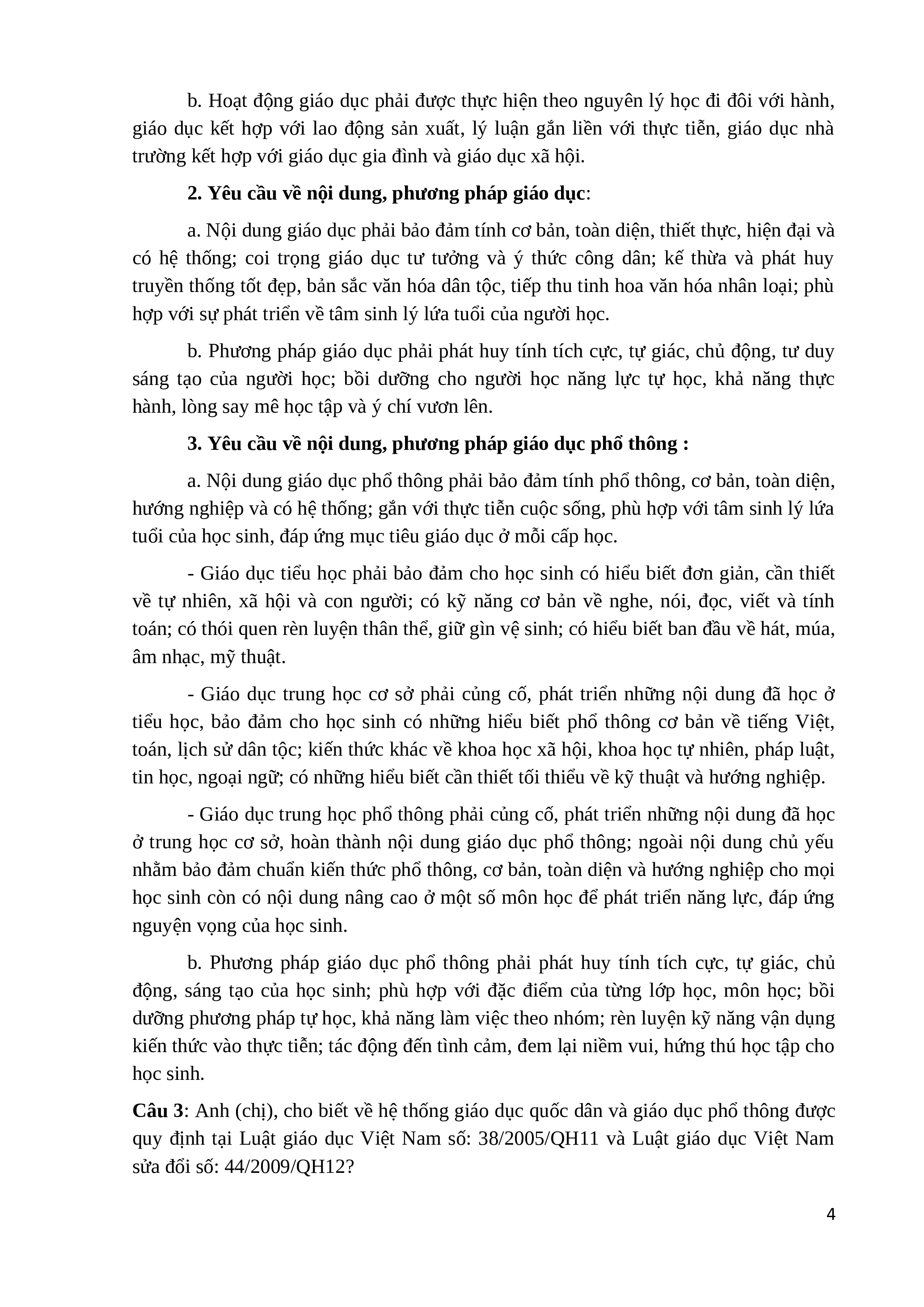 Trả lời: Tính chất, nguyên lý giáo dục và yêu cầu về nội dung, phương pháp