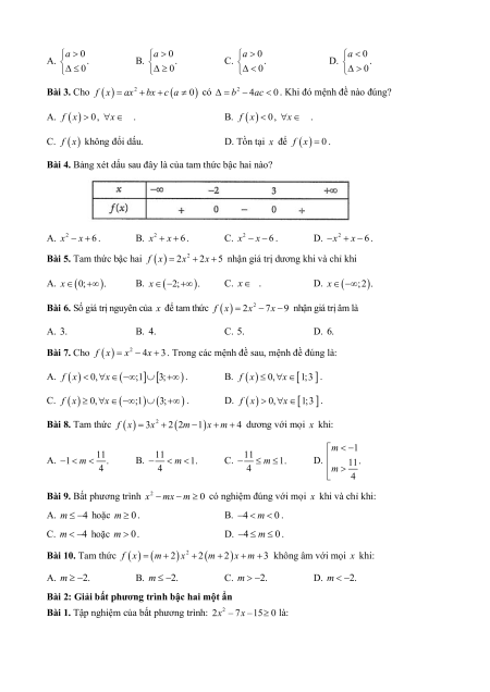 Bài 4. Bảng xét dấu sau đây là của tam thức bậc hai nào? A. 2 x x 6 . B. 2 x x 6. C. 2 x x 6 . D. 2