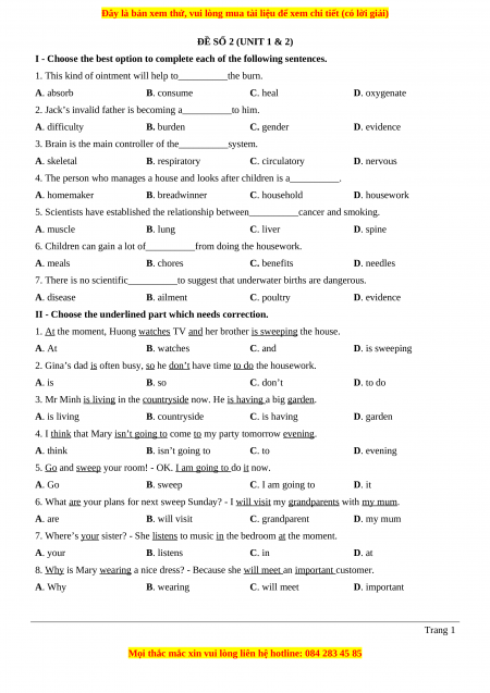 ĐỀ SỐ 2 (UNIT 1 & 2)
