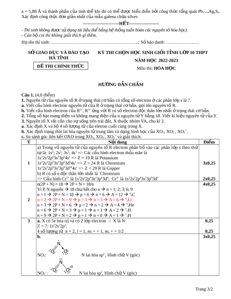 o ên thí sinh: ………………………………………………….; S bá ố o danh: …………………. SỞ GIÁO D C Ụ VÀ ĐÀO T O Ạ KỲ THI CH N Ọ H C Ọ SINH GI I Ỏ T N Ỉ H L P Ớ 10 THPT HÀ TĨNH NĂM HỌC 2022-2023 Đ Ề THI CHÍNH TH C Ứ Môn thi: HÓA H C Ọ HƯ N Ớ G D N Ẫ CH M Ấ Câu 1. (4,0 điêm) 1. Nguyên tử c a ủ nguyên tố R t ở rạng thái c b ơ ản có t ng ổ s e ố lectron c ở ác phân l p s ớ là 7.