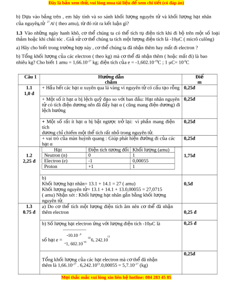 ế 1 amu = 1,66.10-27 kg; điện tích của e = -1,602.10-19C ; 1 C= 10-6C Câu 1 Hướng d n ẫ Điể ch m ấ m 1.1 + Hầu h t