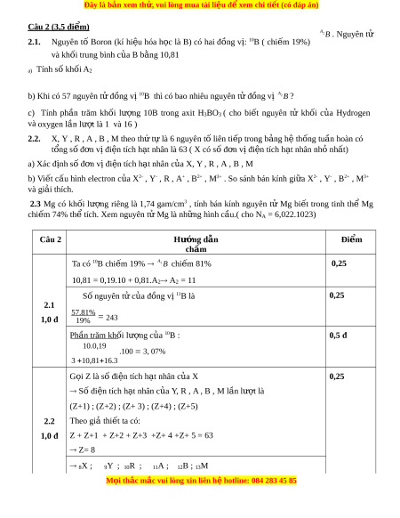 ế 74% thể tích. Xem nguyên tử Mg là những hình cầu.( cho NA = 6,022.1023) Câu 2 Hướng d n ẫ Đi m ể ch m ấ Ta có 10B chi m