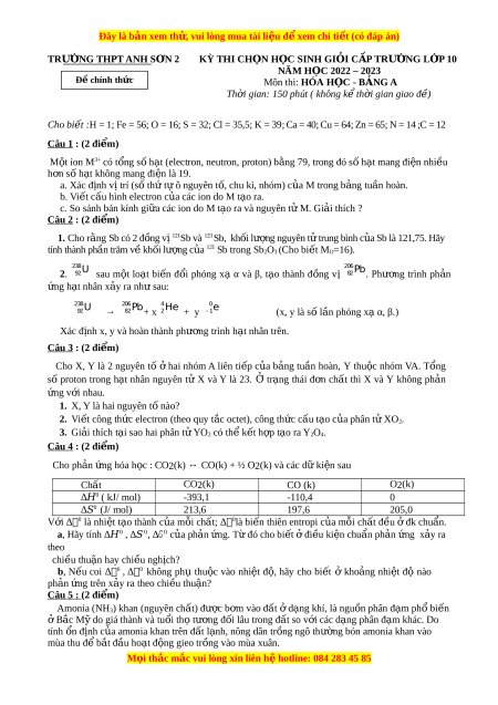 Đây là bản xem th , vu ử i lòng mua tài li u ệ đ xe ể m chi ti t (c ế ó đáp án) TRƯỜNG THPT ANH S N Ơ 2 KỲ THI CHỌN H C Ọ SINH GI I Ỏ C P Ấ TRƯỜNG LỚP 10