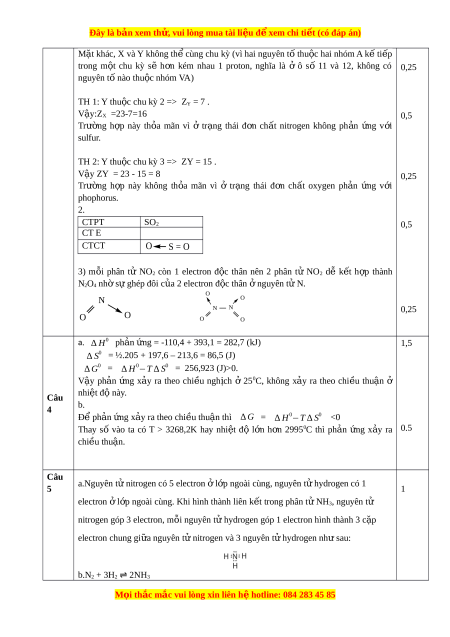 ơ kém nhau 1 proton, nghĩa là ở ô số 11 và 12, không có 0,25 nguyên tố nào thu c ộ nhóm VA) TH 1: Y thu c ộ chu kỳ 2 => ZY = 7 . Vậy:ZX =23-7=16 0,5 Trư ng ờ h p ợ này th a ỏ mãn vì ở tr ng ạ thái đ n ơ ch t ấ nitrogen không ph n ả ng ứ v i ớ sulfur. TH 2: Y thu c ộ chu kỳ 3 => ZY = 15 . Vậy ZY = 23 - 15 = 8 0,25 Trư ng ờ h p ợ này không th a ỏ mãn vì ở tr ng ạ thái đ n ơ ch t ấ oxygen ph n ả ng ứ v i ớ phophorus. 2. CTPT SO2 0,5 CT E CTCT O S = O 3) m i