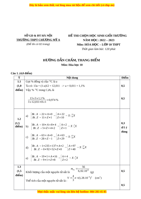 Ớ G DẪN CHẤM, THANG ĐI M Ể Môn: Hóa h c ọ 10 Câu 1. (4,0 đi m) ể Ý N i ộ dung Đi m ể 1.1 G i ọ % đ ng v ô c i ua 13C là a (1,0