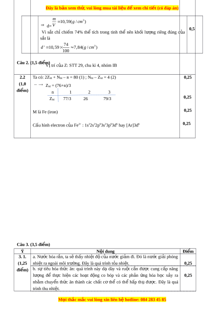 u Fe2+ : 1s22s22p63s23p63d6 hay [Ar]3d6 0,25 Câu 3. (3,5 đi m) ể Ý N i ộ dung Đi m ể 3. 1. a. Nư c ớ hoa r n, ắ ta s ẽ th y ấ nhi t ệ đ ộ c a u nư c ớ gi m ả đi. Đo là nư c ớ gi i ả phong (1,25 nhi t ệ ra ngoài môi trư ng. ờ Đây là quá trinh t a ỏ nhi t ệ . 0,25 đi m) ể b. sư tiêu hoa th c