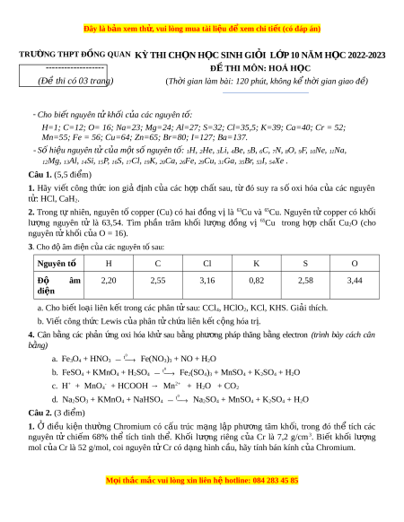Ồ G QUAN KỲ THI CH N Ọ H C Ọ SINH GI I Ỏ L P Ớ 10 NĂM H C Ọ 2022-2023 ------------------- Đ Ề THI MÔN: HOÁ H C Ọ