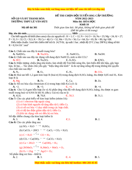 TRƯỜNG THPT LÊ VĂN H U Ư Môn thi: HÓA HỌC Kh i ố 10 Mã đ t ề hi 301