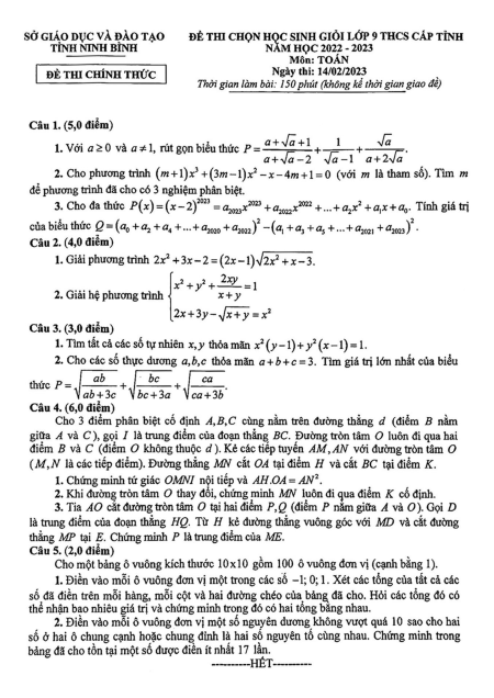 Đề HSG Toán 9 cấp tỉnh - Ninh Bình năm 2022-2023 có đáp án