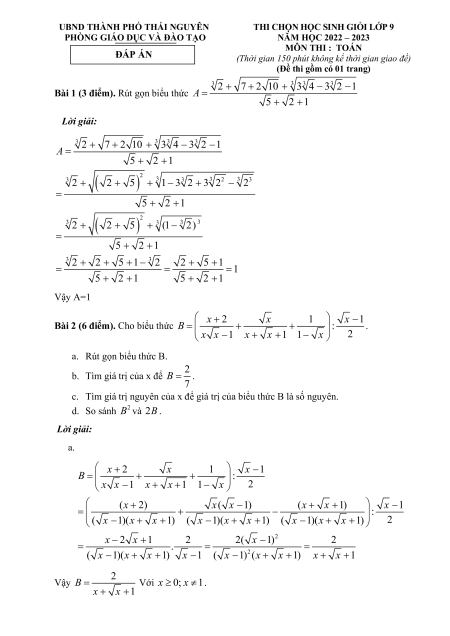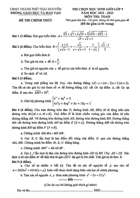 Đề HSG Toán 9 cấp tỉnh - Thái Nguyên năm 2022-2023 có đáp án