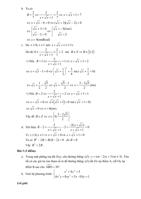 c. Tìm giá trị nguyên của x để giá trị của biểu thức B là số nguyên. d. So sánh 2 B và 2B . Lời giải: a. x + 2 x 1 x −1 B = + + :