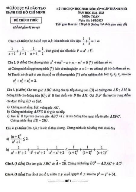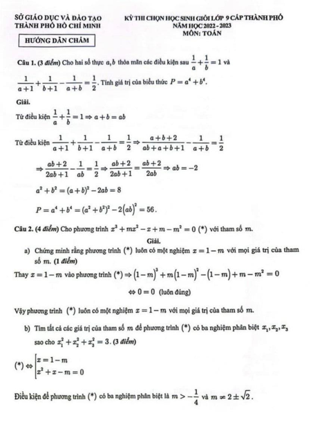 Đề HSG Toán 9 cấp TP - TP HCM năm 2022-2023 có đáp án