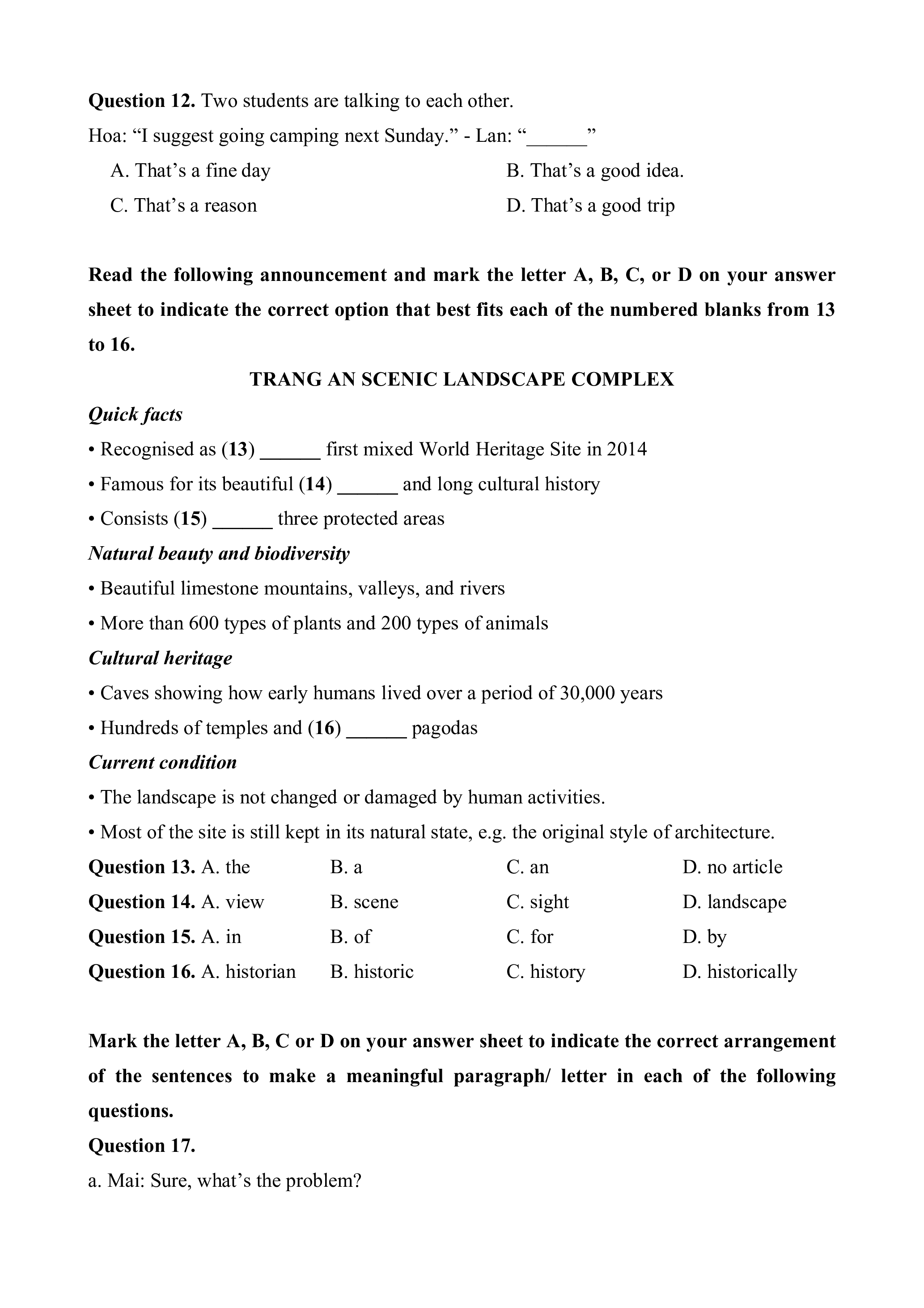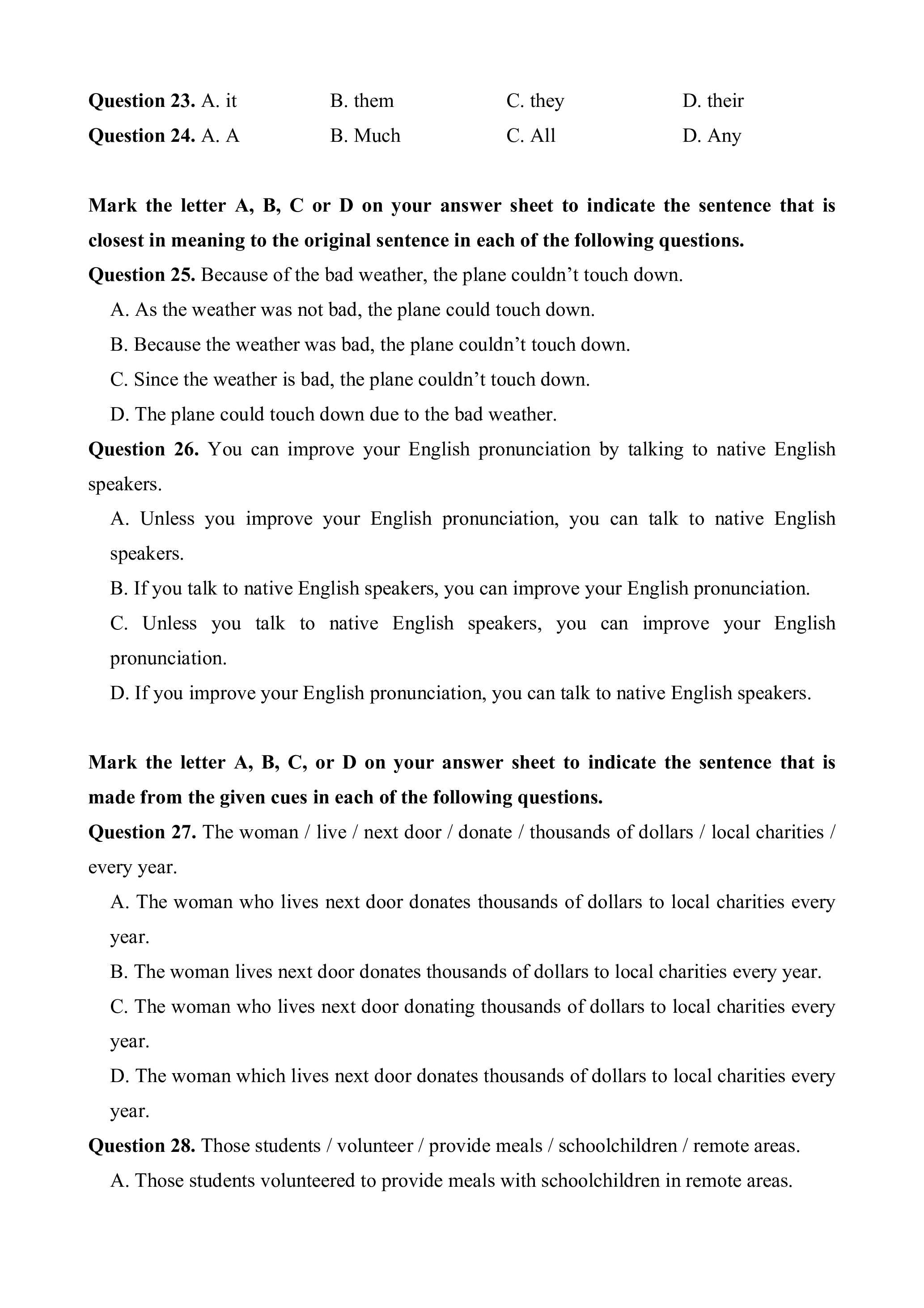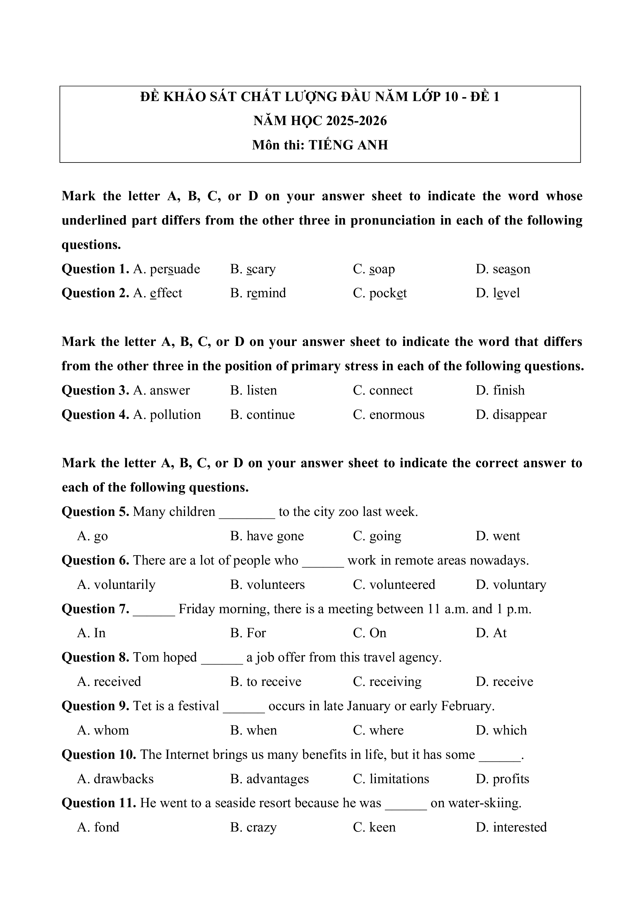 Đề khảo sát chất lượng đầu năm lớp 10 Tiếng Anh