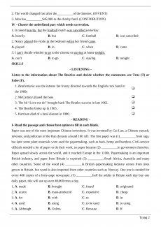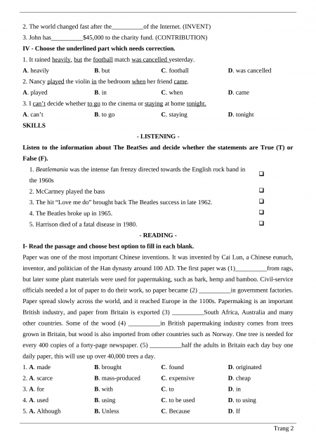 daily paper, this will use up over 40,000 trees a day. 1. A. made B. brought C. found D. originated 2. A. scarce B. mass-produced C. expensive D. cheap 3. A. for B. with C. to D. in 4. A. used B. using C. to be used D. to using 5. A. Although B. Unless C. Because D. If Trang 2