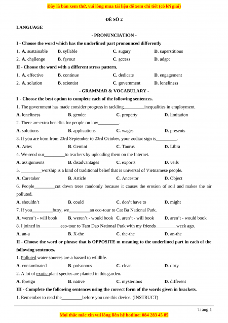 ĐỀ SỐ 2 LANGUAGE - PRONUNCIATION -