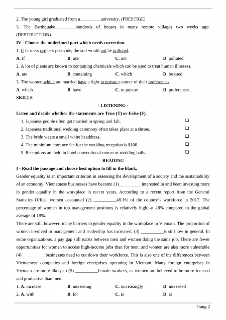 Vietnam are more likely to (5) __________female workers, as women are believed to be more focused and productive than men. 1. A. increase B. increasing C. increasingly D. increased 2. A. with B. for C. to D. at Trang 2 3. A. but B. or C. and D. because 4. A. although B. when C. therefore D. unless 5. A. have B. attract C. impress D. employ