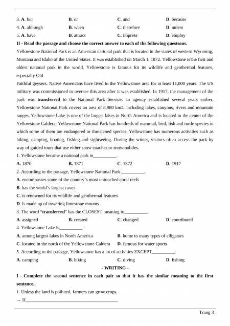 5. According to the passage, Yellowstone has a lot of activities EXCEPT__________. A. camping B. hiking C. diving D. fishing - WRITING -