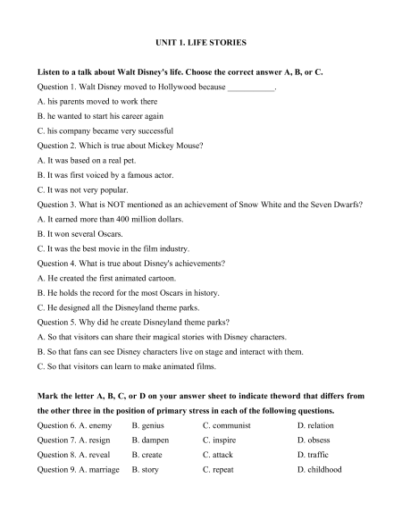 the other three in the position of primary stress in each of the following questions. Question 6. A. enemy B. genius C. communist D. relation Question 7. A. resign B. dampen C. inspire D. obsess Question 8. A. reveal B. create C. attack D. traffic Question 9. A. marriage B. story C. repeat D. childhood