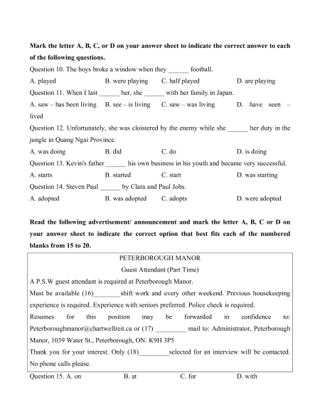 your answer sheet to indicate the correct option that best fits each of the numbered blanks from 15 to 20. PETERBOROUGH MANOR Guest Attendant (Part Time)