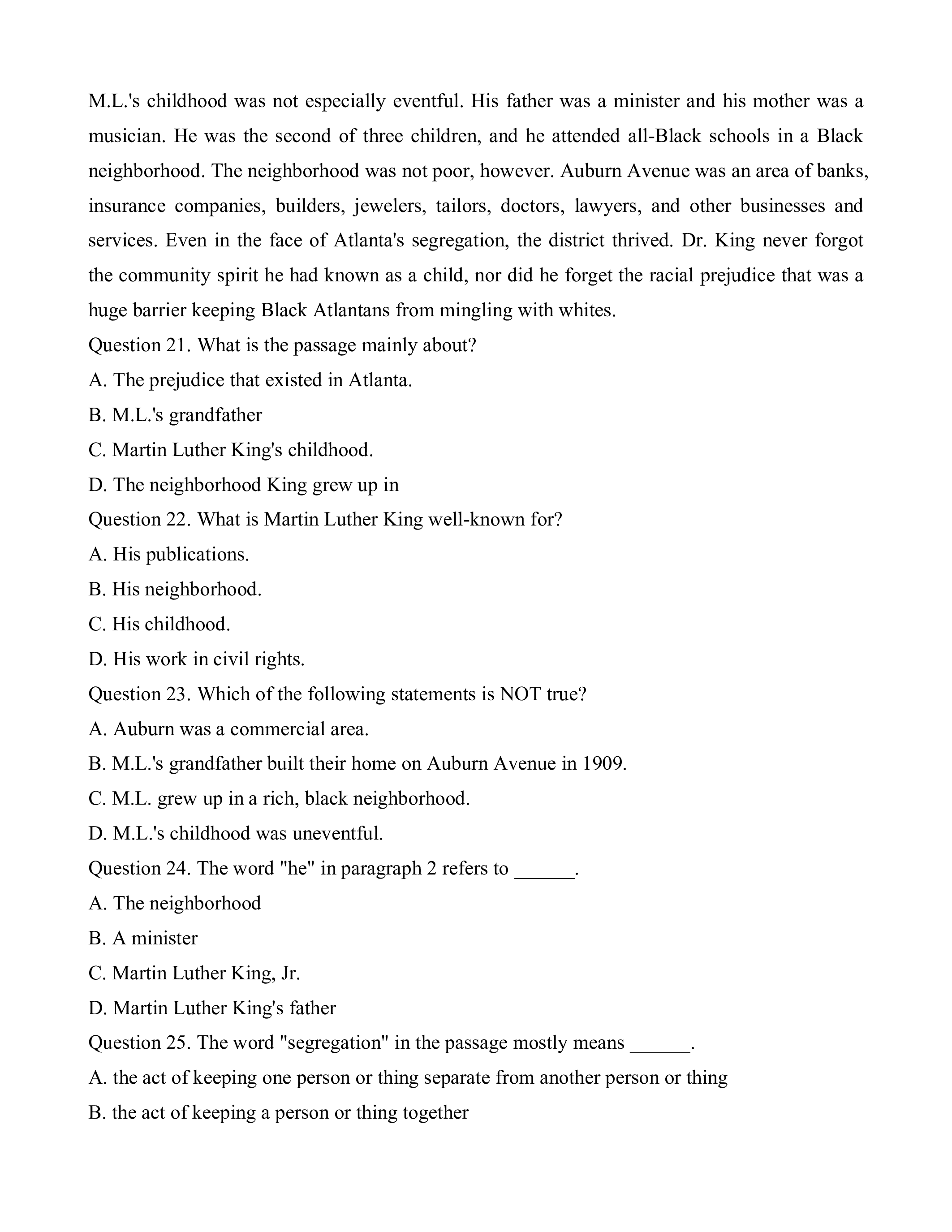 Question 24. The word "he" in paragraph 2 refers to ______. A. The neighborhood B. A minister C. Martin Luther King, Jr. D. Martin Luther King's father